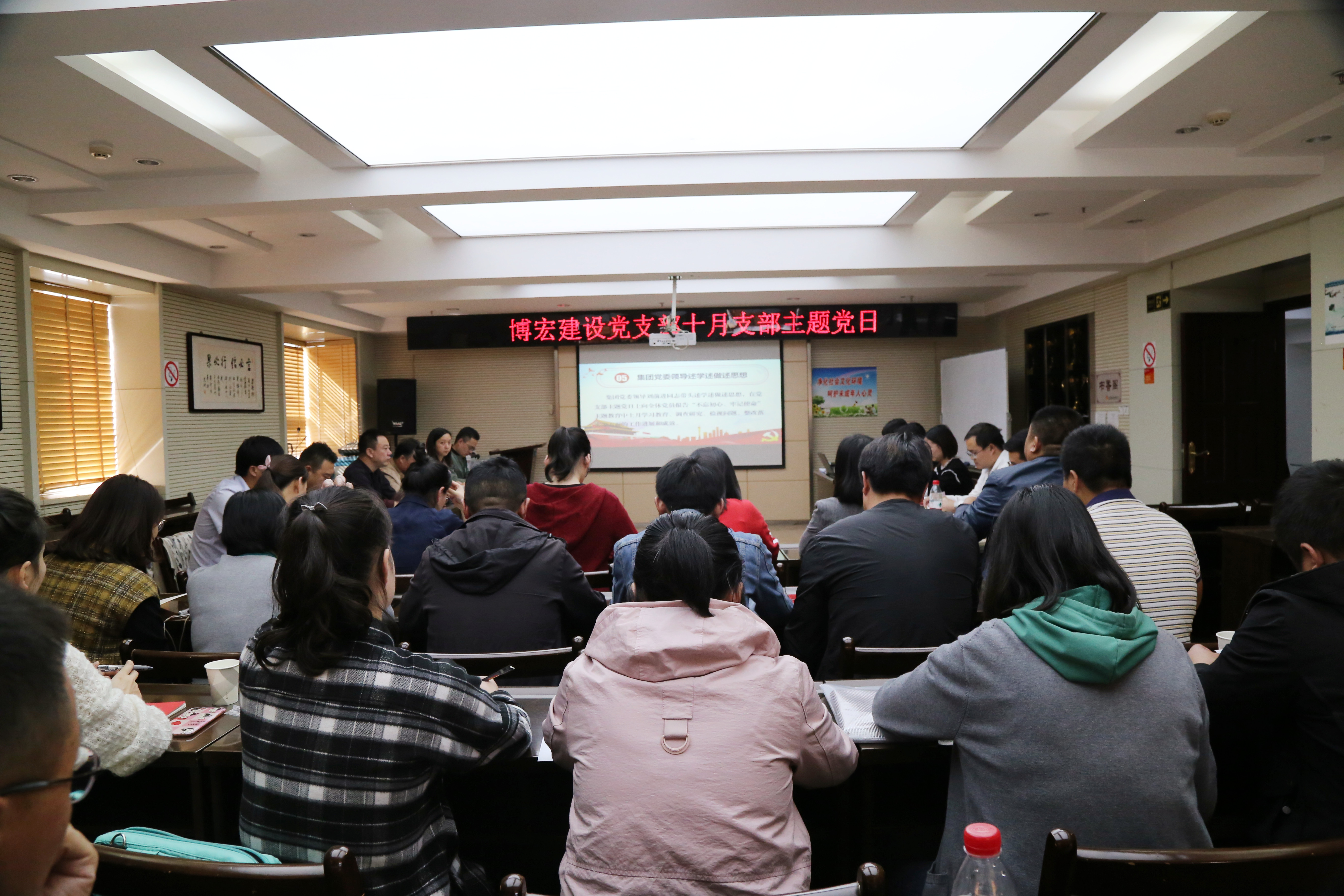? ? ? 為扎實(shí)開展“不忘初心、牢記使命”主題教育工作,全面把握守初心、擔(dān)使命、找差距、抓落實(shí)的總要求,10月31日,博宏建設(shè)黨支部在公司大會(huì)議室召開了以“述學(xué)述做述思想,發(fā)揮黨員先鋒模范作用”為主題的黨日活動(dòng)。此次活動(dòng)包含黨委成員工作匯報(bào)、黨員同志學(xué)習(xí)交流、習(xí)總書記重要講話精神學(xué)習(xí)以及觀看警示教育宣傳片等四個(gè)環(huán)節(jié)。