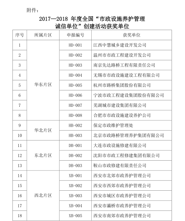 近日,經(jīng)過中國市政工程協(xié)會市政設(shè)施管理專業(yè)委員會評選,漢陽市政首次榮獲2017-2018年度“市政設(shè)施養(yǎng)護(hù)管理誠信單位”,彰顯了公司在市政管養(yǎng)領(lǐng)域的模范帶頭作用。