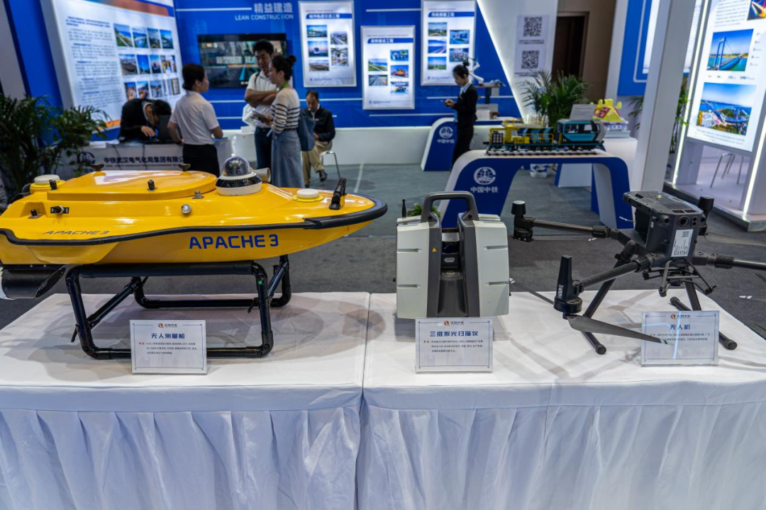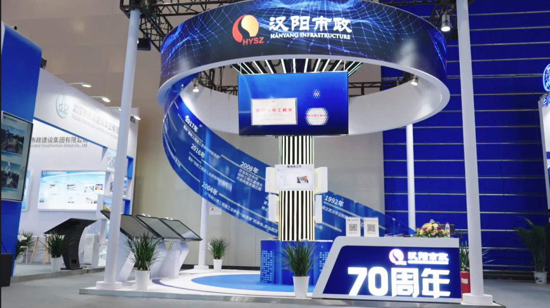 漢陽(yáng)市政展區(qū)以綠色建造、智能建造為主題,分享集團(tuán)數(shù)字化轉(zhuǎn)型的成果。本次展覽告別傳統(tǒng)展陳形式,以漢陽(yáng)樹為靈感,樹冠處連接飄帶,增添靈動(dòng)感,大面積采用科技藍(lán)、白色來點(diǎn)綴,營(yíng)造不一樣的活力氛圍。展區(qū)以漢陽(yáng)樹為中心,展示了公司70年發(fā)展歷程、取得的重點(diǎn)業(yè)績(jī)和榮譽(yù)獎(jiǎng)項(xiàng)、聯(lián)合體工作、綠色技術(shù)、綠色產(chǎn)業(yè),以及企業(yè)數(shù)字化轉(zhuǎn)型、CIM基礎(chǔ)平臺(tái)建設(shè)等內(nèi)容。