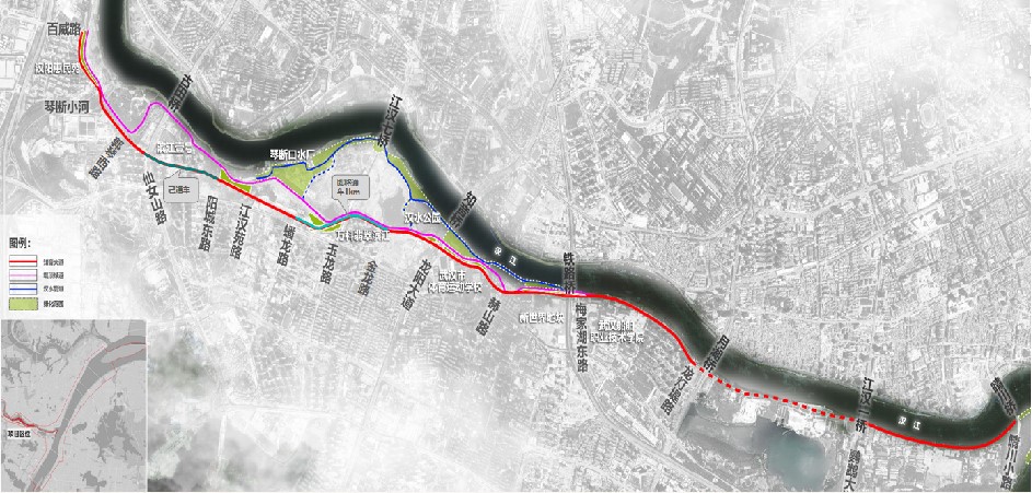 漢江南岸綜合治理工程EPC項目主要建設(shè)內(nèi)容為知音大道提升改造和漢水碧道建設(shè),項目估算總投資38.33億元。知音大道改造提升工程包含百威路至龍燈堤路段、江漢一橋至晴川小路段,道路長約9.5km,紅線寬25至35m,雙向4車道,部分路段道路與堤防局部結(jié)合,采用橋梁形式上跨琴斷口小河,通道形式下穿龍陽大道和京廣鐵路;新建和改造防汛道路約6.39km,并進(jìn)行路堤加固、防滲和防護(hù)處理,同步建設(shè)排水、交通、照明、綠化等配套設(shè)施。